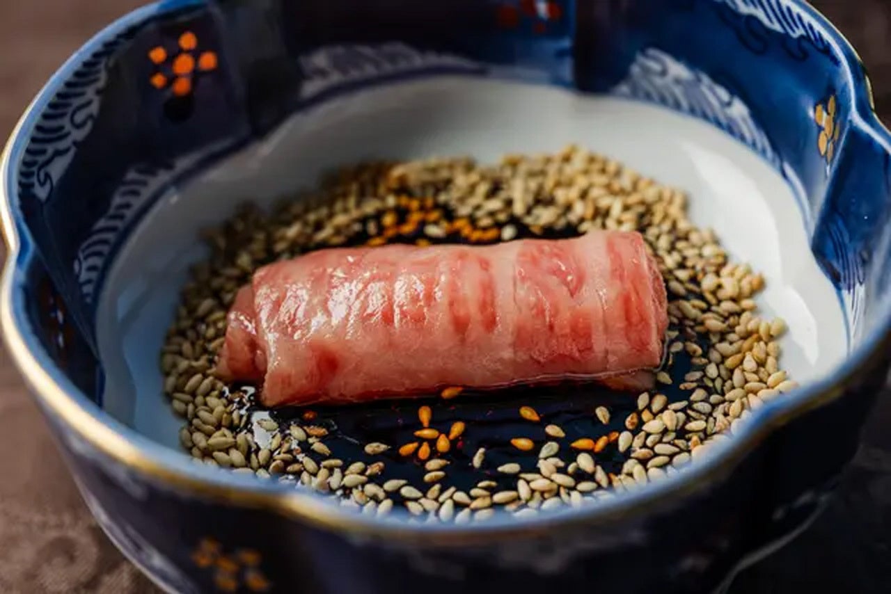 通常、鶏肉でつくる料理をあえてA5和牛のサーロインを使用。サーロインを一度さっとお湯にくぐらせ、余分な油を落としてから自家製のソースと合わせます。ソースは力強い牛肉に負けないよう、あえて酸味をやや強めに。