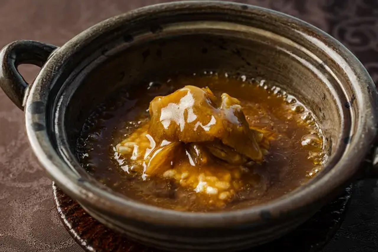 最高級品と言われる宮城県気仙沼産の吉切鮫の尾びれを使用。ソースには、鶏白湯にフォアグラや鴨肉、香味野菜を合わせた、濃厚な"金湯(ガムトン)"を使用し、フカヒレをじっくりと煮込みました。うまみがたっぷり抽出されたスープと、それを吸い込んだフカヒレがなんともいえない味わいです。