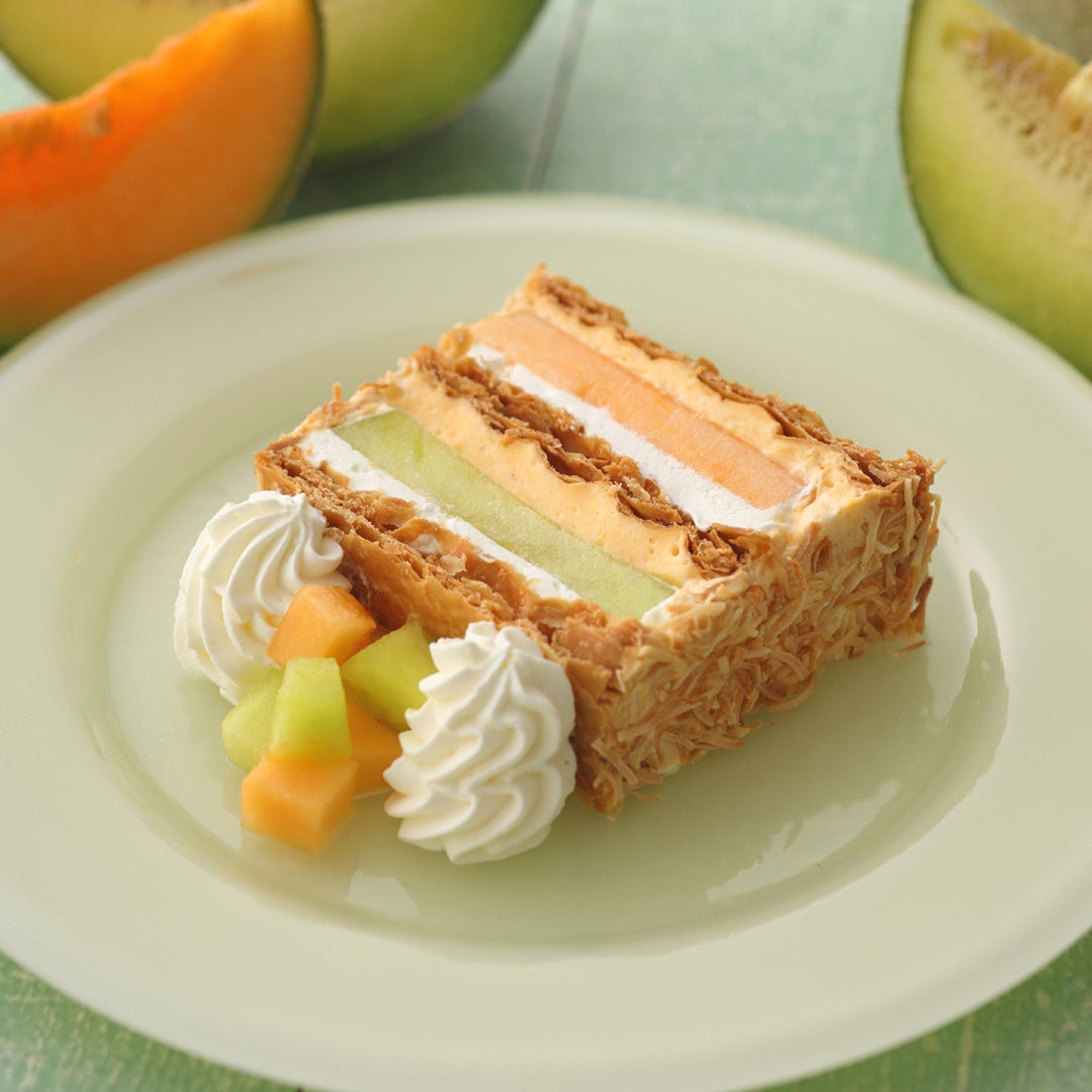 マイルドで上品な甘みと果肉感のある“赤肉メロン”と、とろける甘みが際立つ芳醇な香りの“青肉メロン”。2種類のメロンをサクサクパイ生地で贅沢に味わう一品です。