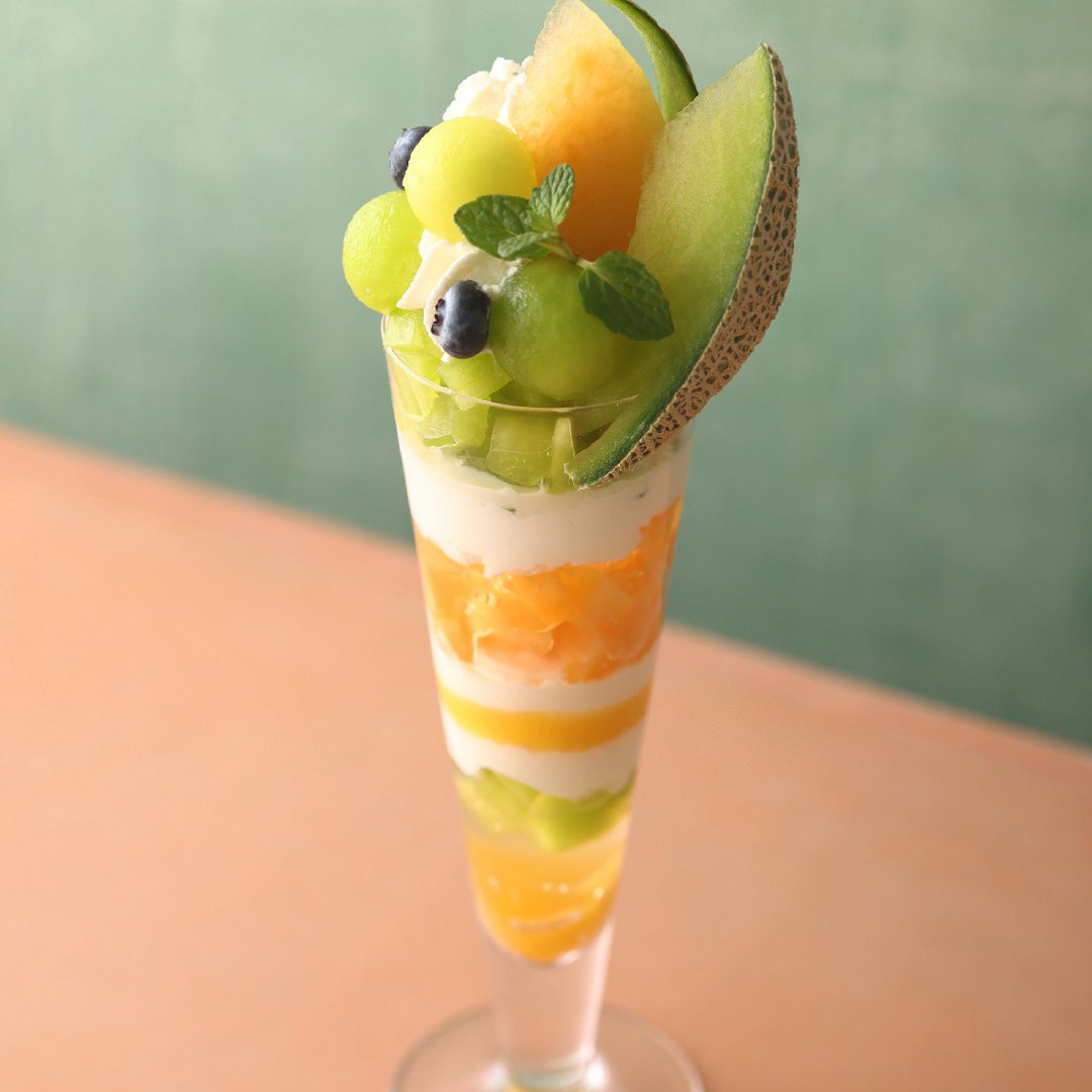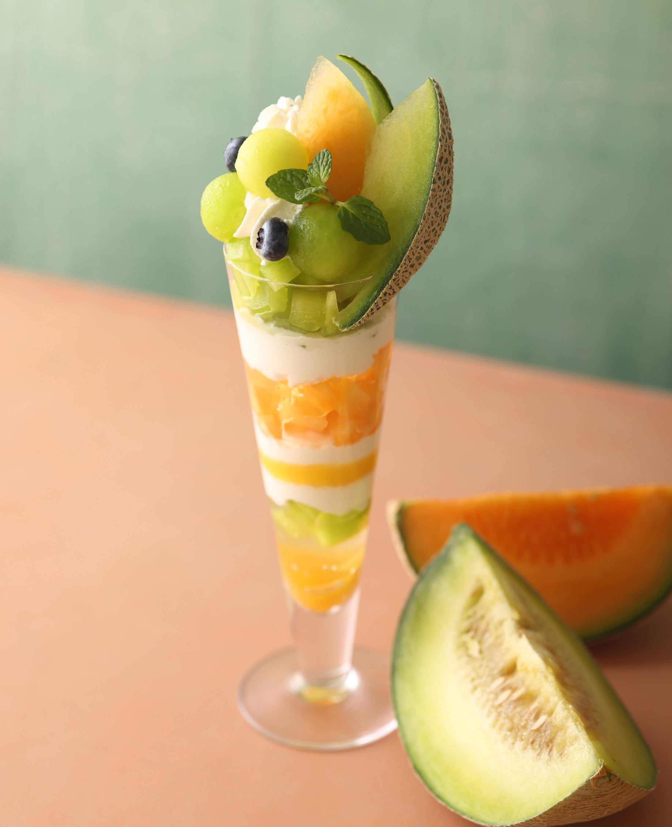 2種類のメロン、マスカルポーネクリーム、バニラアイスを合わせたダブルメロンパフェ。クレーム・シトロンの酸味が味を引き立てています。