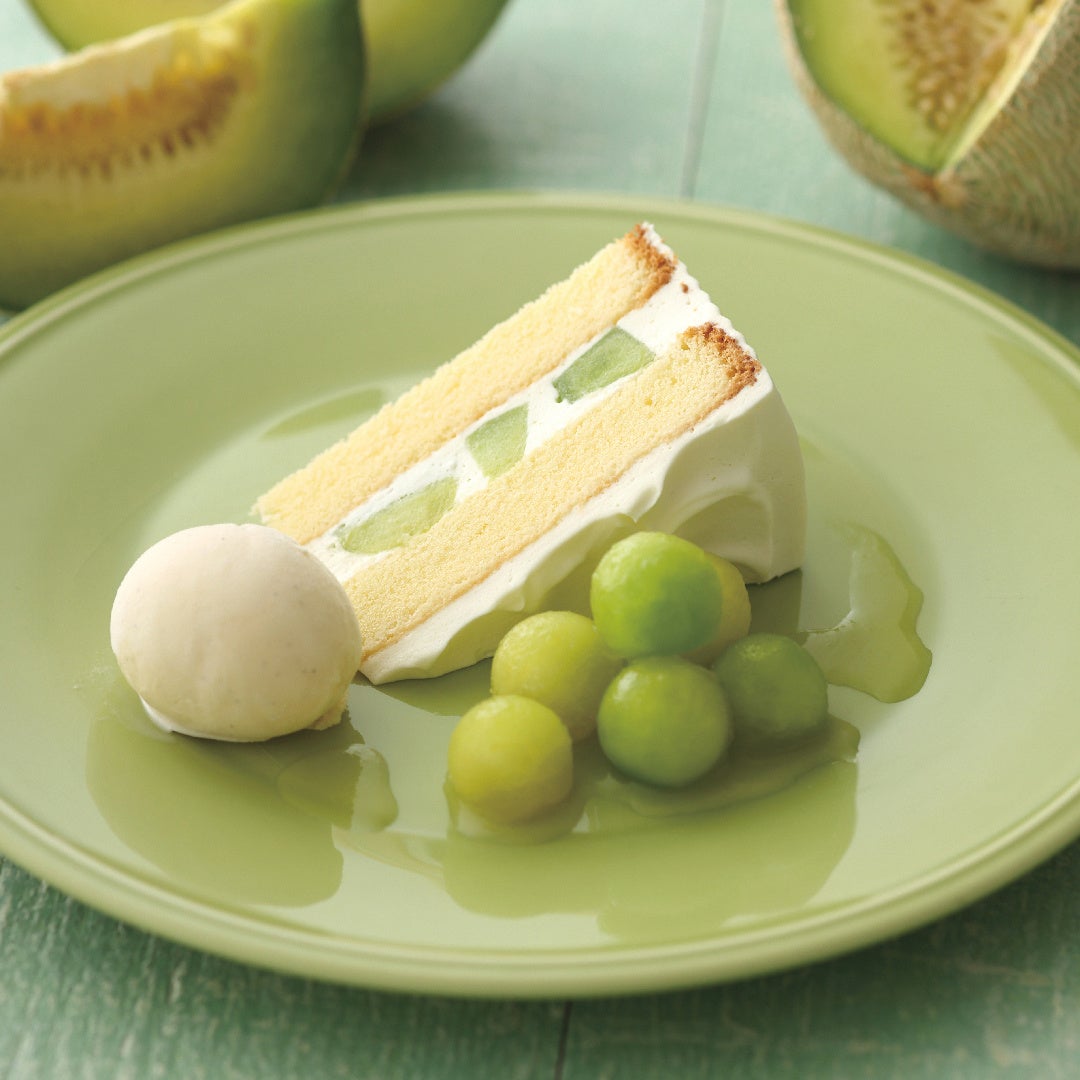 旬を迎えたメロンを、生クリームとスポンジでサンドした初夏のショートケーキ。バニラアイスを添えて。