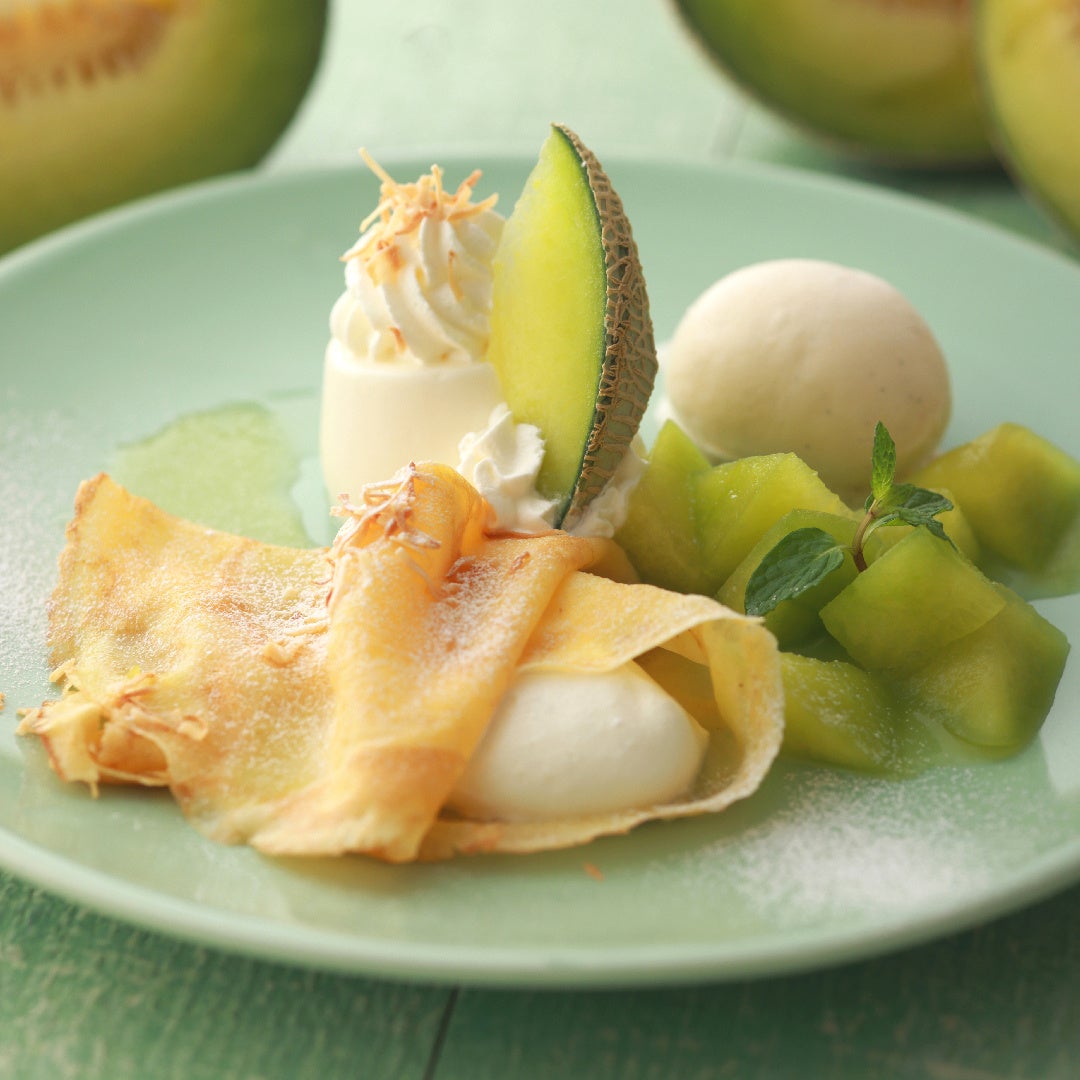 フルフルのパンナコッタとクレープを、フレッシュの青肉メロン、バニラアイスと合わせました。香ばしくローストしたココナッツがアクセント。