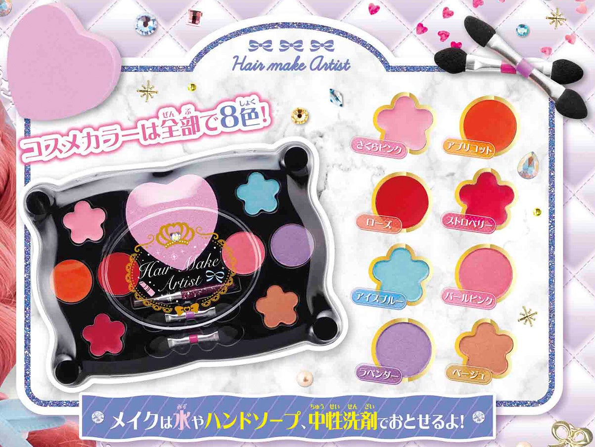 また、同商品は全8色のデラックスコスメパレットが付属しており、ドールに口紅をぬったりアイシャドーを入れたりメイクをもすることもできます。最後にアクセサリーシールを貼って完成です。
