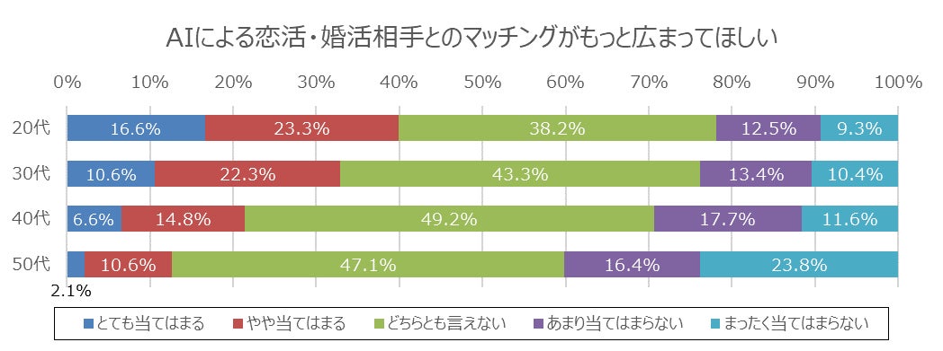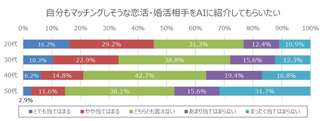 まず、「AIによる恋活・婚活相手とのマッチングがもっと広まってほしい」という考え方について、自分にどの程度当てはまるかを尋ねました。