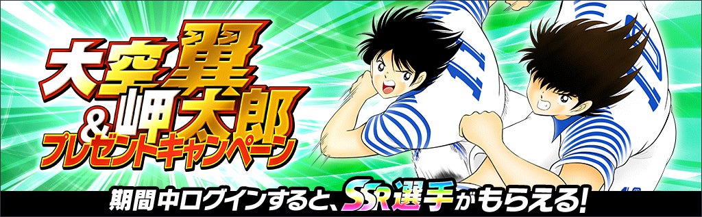期間中ログインすると、全日本(JY)のSSR新選手 大空 翼、岬 太郎が手に入ります。