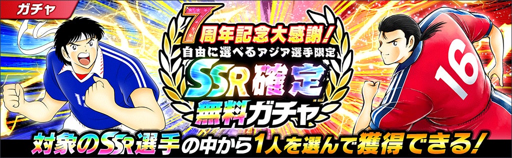 「7周年記念大感謝!自由に選べるアジア選手限定SSR確定無料ガチャ」