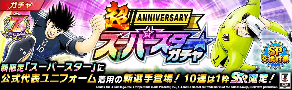 また、「7周年記念 超ANNIVERSARYスーパースターガチャ」には最新のサッカー日本代表公式ユニフォームを着用した大空 翼、若林 源三が新選手で登場!この機会に是非ゲームをお楽しみください!