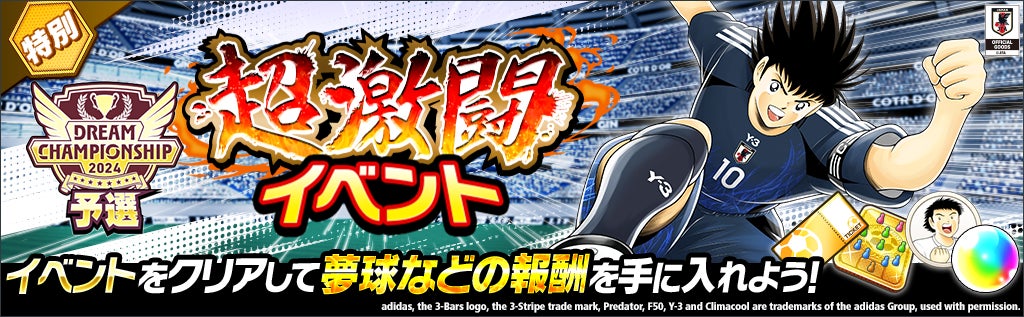 イベントをプレイして獲得できるイベントPで夢球などの報酬が手に入る激闘イベントです。「7周年記念 超ANNIVERSARYスーパースターガチャ」で新登場する大空 翼や若林 源三をチームに起用すると、イベントPをより多く獲得できます。日本版とグローバル版のイベントPランキングで1位のプレイヤーは、「DREAM CHAMPIONSHIP 2024」の決勝トーナメントへの出場権を獲得できます。