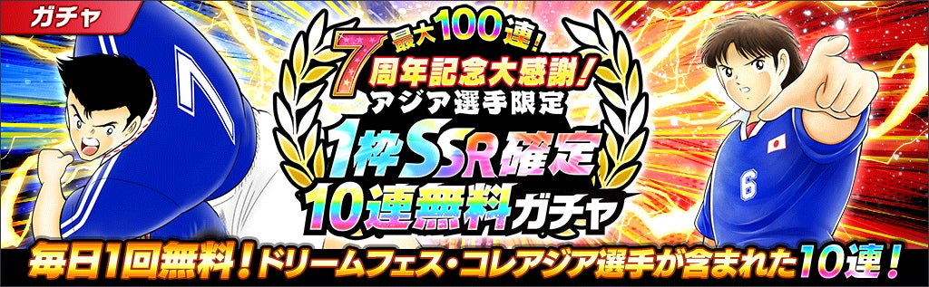 「最大100連!7周年記念大感謝!アジア選手限定1枠SSR確定10連無料ガチャ」