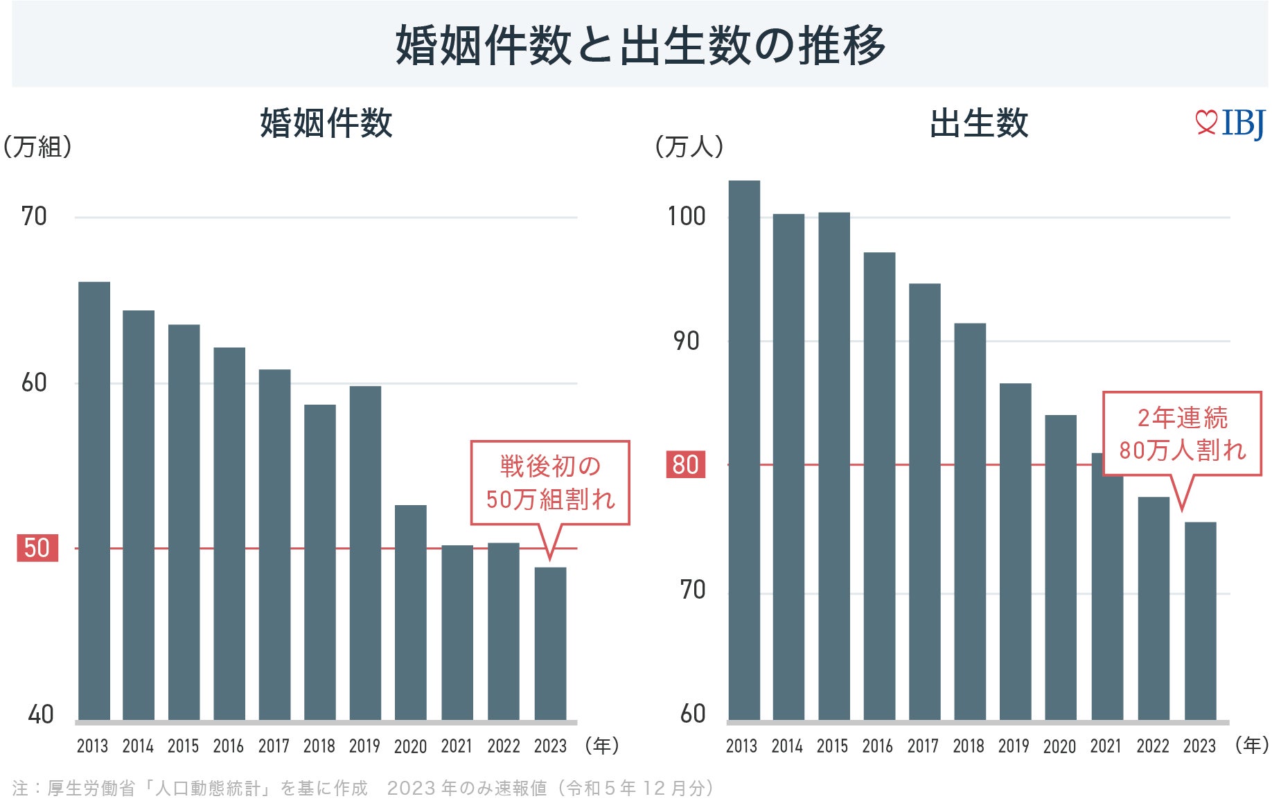 2024年⼈⼝動態統計(概数)では、出⽣数が初の70万⼈割れになる可能性が⾼くなると予想されています。一方で、夫婦(既婚⼥性)から⽣まれる⼦どもの数を⽰した完結出⽣児数は1.90人と、約40年前から2人前後で推移しており大きな変化は見られないことから、未婚化や晩婚化、出会いの減少や、恋愛の進め⽅が分からない等の理由が出生数の減少に繋がっていると考えられます。