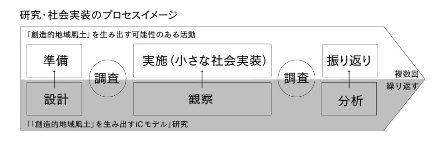 今回の取り組みでは、日置市役所をはじめとした複数の団体や企業と共に、「『創造的地域風土』を生みだすiCモデル」の行動群をベースに具体的な活動プランの設計から実施、各種調査を行います。その結果を踏まえた活動内容の見直しにいたるまでを複数回繰り返し、社会実装を目指します(下図参照)。「iCモデル」を実際の地域に適用しながら、エスノグラフィ(行動観察)調査を通じて市民の行動を分析。また、定点で定量・定性調査を行い、活動プランに対する市民の評価や意見を聴取。それらの結果からみえてきた課題を活動内容に反映させながら本モデルの有効性の検証とアップデートを、約1年をかけ推進していきます。