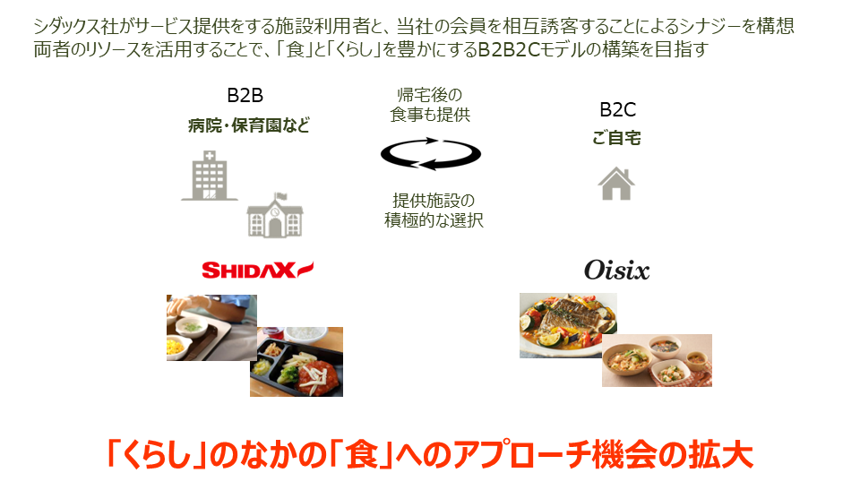 シダックスが強みとする、病院や保育園、学童保育などのB2B(Business to Business)の事業領域と、当社が強みとするB2C(Business to Consumer)の事業領域の、それぞれで培ったノウハウやネットワークを活用することで、B2B2C領域でのさらなる事業拡大を目指してまいります。