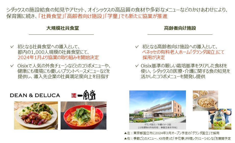 実際に、シダックスの施設給食の知見やアセットと、当社のミールキットを活用した高品質の食材や多彩なメニューなどのかけあわせにより、社員食堂や高齢者向け施設給食において、協業がスタートしております。