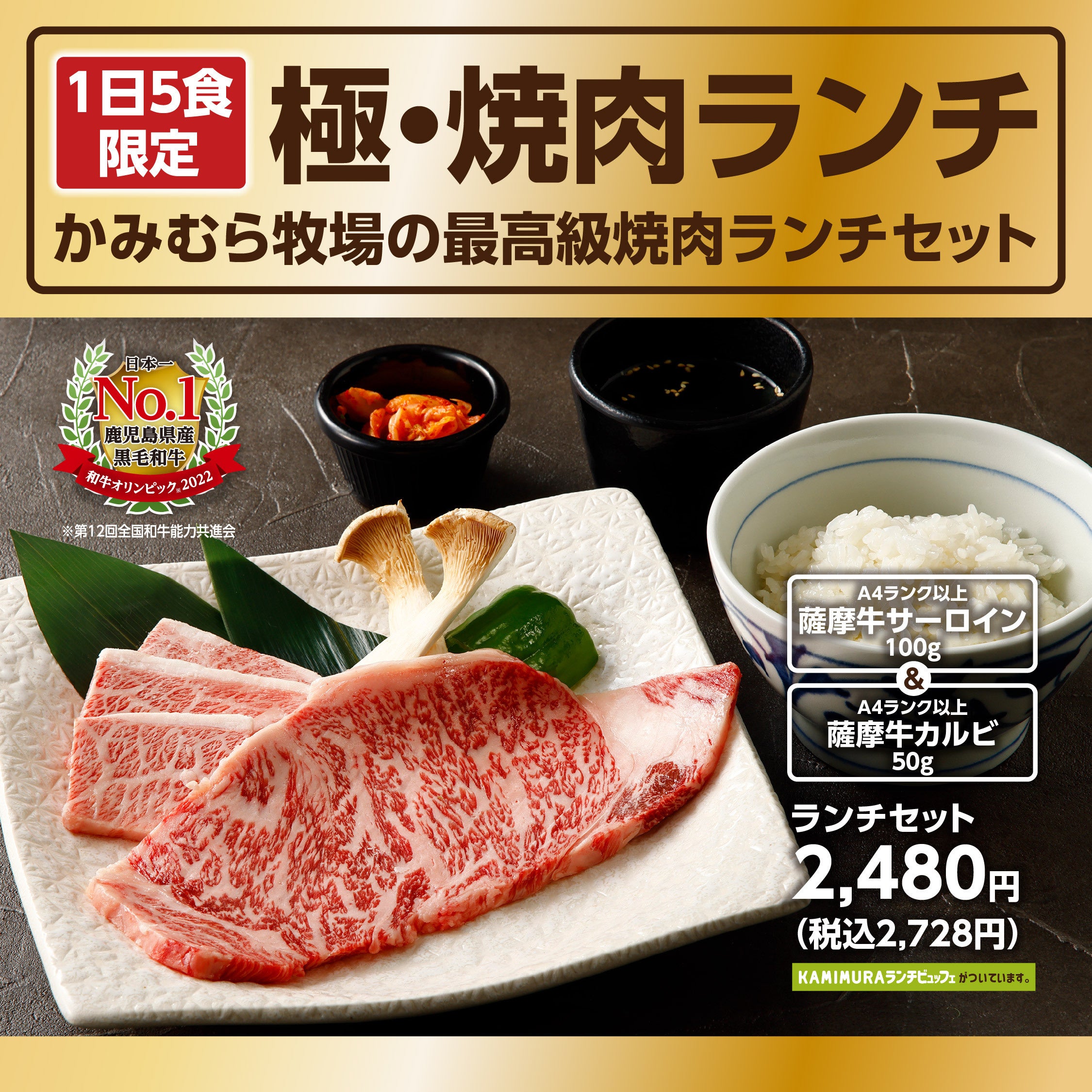 その「焼肉ランチ」にこの度、「かみむら牧場」史上最高級焼肉ランチセットとしてA4ランク以上黒毛和牛の薩摩牛でご用意する「極・焼肉ランチ」は2種類で、1月16日(月)から1月20日(金)までは「薩摩牛サーロイン(100g)&薩摩牛カルビ(50g)」の焼肉ランチセット、1月23日(月)から1月25日(水)までは「薩摩牛リブロース(150g)」の焼肉ランチセットをそれぞれ1日5食限定で、どちらもサラダやキムチ・ナムル、アイスクリームが食べ放題のビュッフェとドリンクバーがセットの「KAMIMURAランチビュッフェ」がついて2,480円(税込2,728円)で販売をいたします。