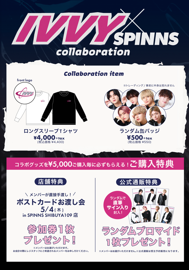 2023年5月4日(木) イベント当日にIVVY×SPINNSコラボレーション商品税込5,000円毎お買い上げで1枚ポストカードお渡し会参加券を配布いたします。お会計の際にご希望されるメンバーをお申し付けください。
