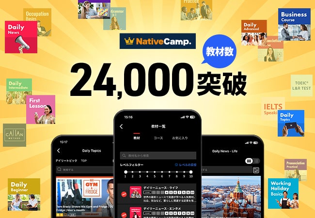 ネイティブスピーカーと回数無制限のオンライン英会話サービス「ネイティブキャンプ英会話」を展開する株式会社ネイティブキャンプ(東京都渋谷区 代表取締役:谷川国洋)は2025年4月6日(日)、国内オンライン英会話サービス業界でNo.1*となる総教材数24,000を突破しました。