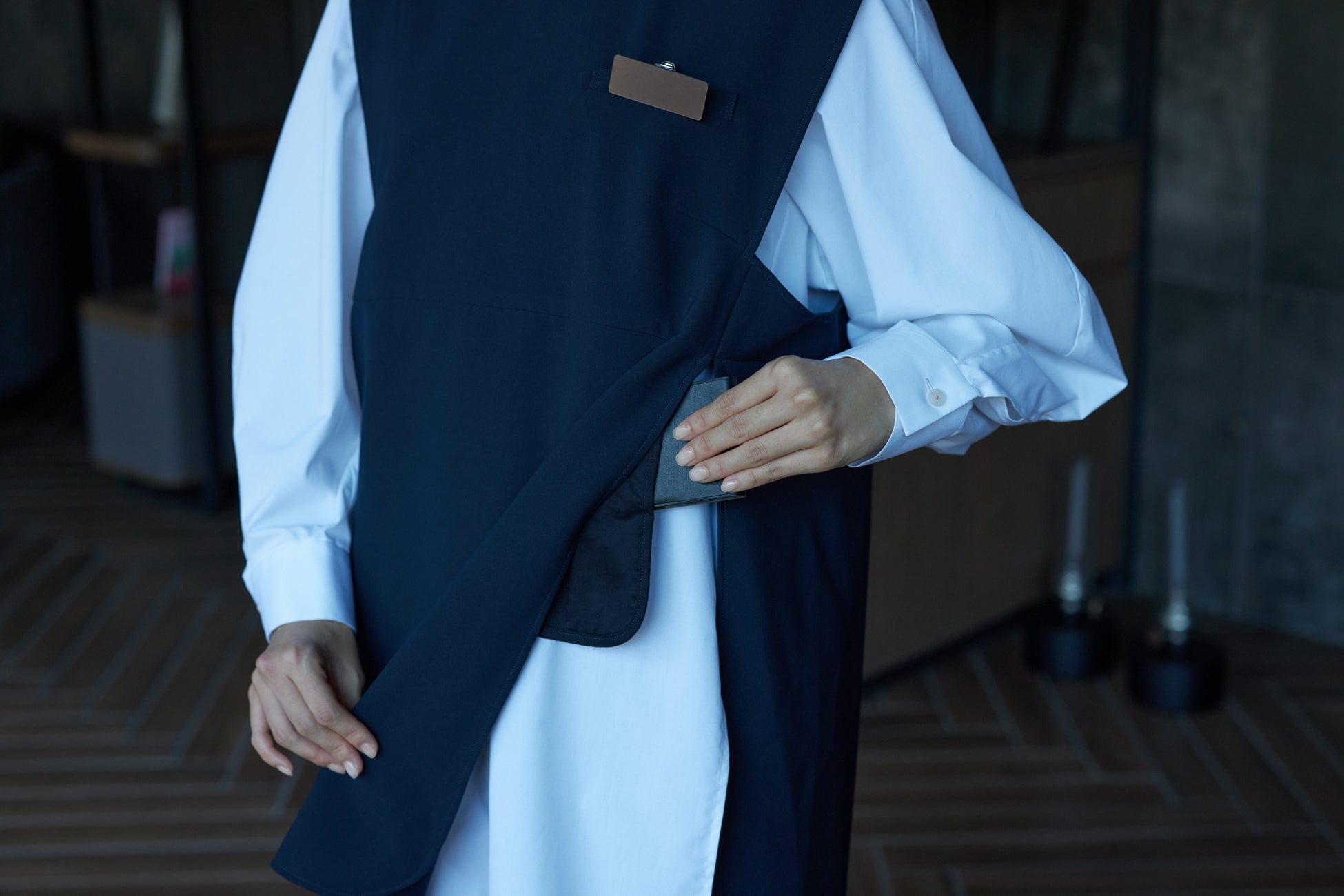 スタッフが仕事をするうえで欠かせないペン、ノート、インカム、スマートフォン、ビジネスカードなどをいかに取り出しやすく美しく収めるかを考えたシャツやベストをはじめ、接客時に立ち膝をしても邪魔にならない独立ポケットが付属したトラウザー、皺になりにくく制服としての耐久性にも優れた素材の選定など機能面に配慮したレディース4型、メンズ3型のラインナップとなっています。