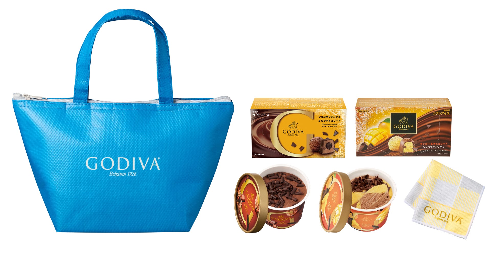 カップアイスクリーム2種とショコラフォンデュ2種に、ゴディバロゴ入りのハンドタオルをセットにし、オリジナルの保冷バッグに詰め合わせました。濃厚なミルクチョコレートとフルーティーで爽やかなマンゴーの味わいを楽しめる、贅沢なアイスセットです。