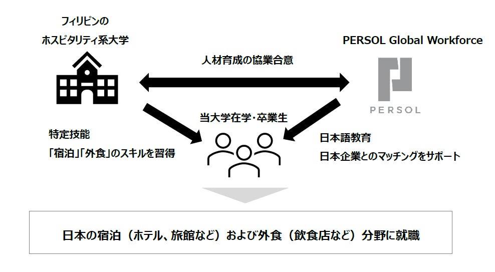 このような課題を受け、PERSOL Global Workforceは、今後の宿泊、外食分野の外国人材確保に向けて、フィリピンのホスピタリティ系大学※5と共に人材育成・日本就職に関するスキームを構築します。