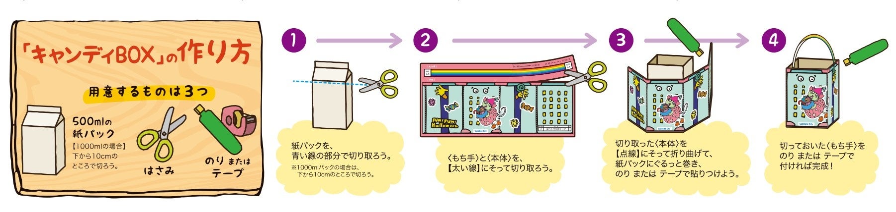 紙パックで作るキャンディBOXの台紙と作り方を館内で配布するチラシやイベント公式ウェブサイトに公開。今年はサンシャイン60ビルをテーマにしたデザインになっています。ご自宅にて親子でワークショップをお楽しみください。作ったキャンディBOXを受付場所にお持ちいただいた方に、お菓子の詰め合わせをプレゼントします。