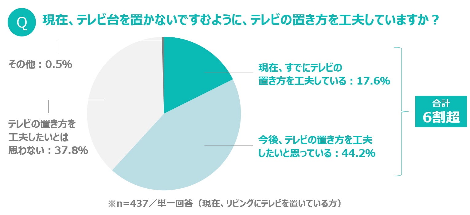 実際に、リビングにテレビを置いている人(n=437)に、「現在、テレビ台を置かないですむように、テレビの置き方を工夫していますか?」と聞いた質問では、「現在、すでにテレビの置き方を工夫している(テレビ台をなくしている)」人が約6人に1人(17.6%)に。「今後、テレビの置き方を工夫したいと思っている(テレビ台をなくしたい気持ちがある)」人(44.2%)と合計すると、6割を超える(61.8%)ことになります。