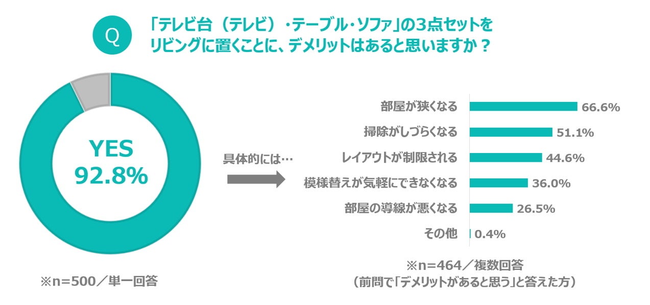 しかし、これらの「三種の神器」をセットでリビングに置くことについては、「デメリットがあると思う」人も92.8%に。具体的なデメリットとしては、「部屋が狭くなる」(66.6%)、「掃除がしづらくなる」(51.1%)、「レイアウトが制限される」(44.6%)などの回答が多くあがりました。テレビ台(テレビ)・テーブル・ソファの「三種の神器」は、広さやレイアウトの制限につながる“とらわれ家具”になりがちであることがわかります。