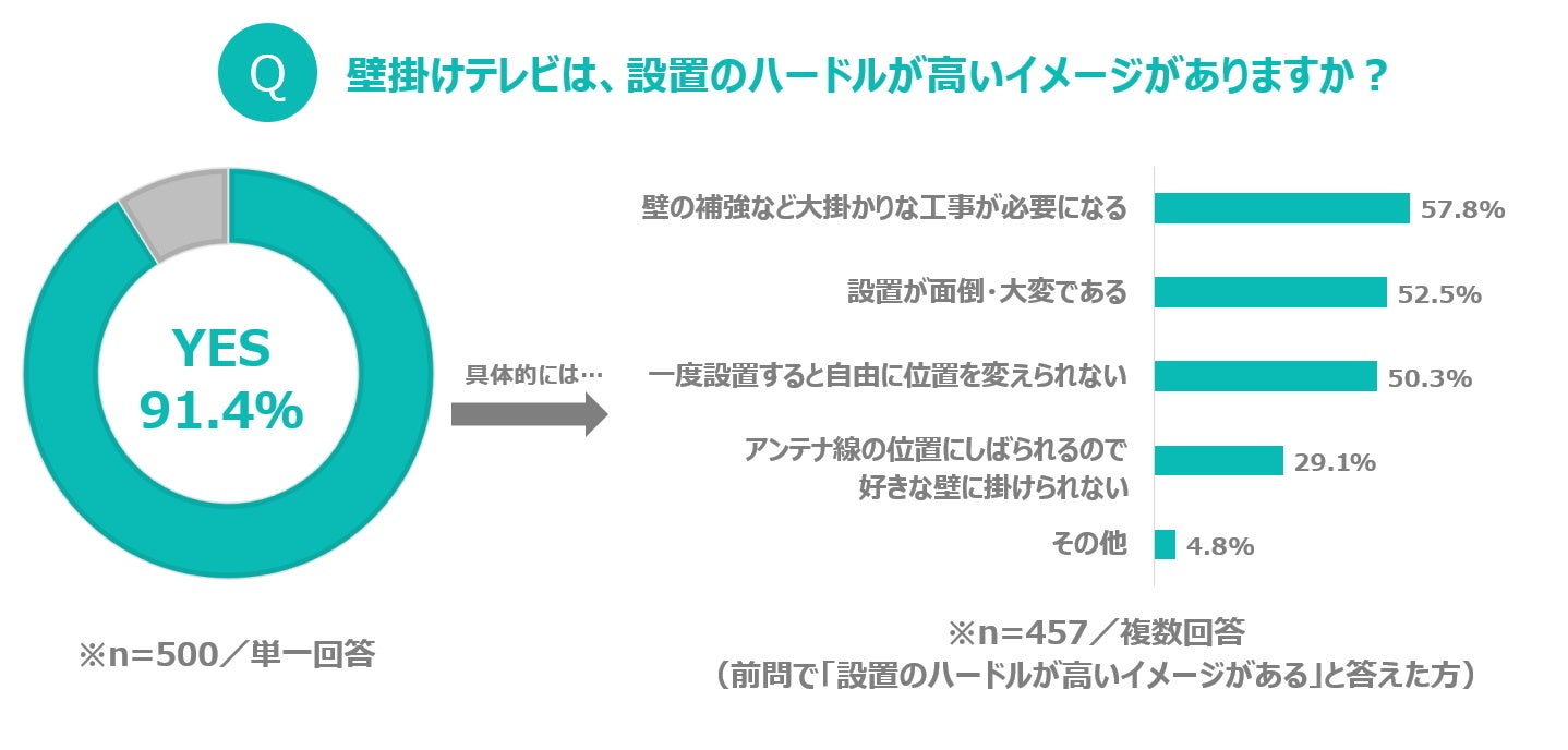しかし、一方で、「テレビの置き方」として最も人気が高かった「壁掛けテレビ」については、「設置のハードルが高いイメージがある」人が91.4%にのぼっています。具体的に「どのような点にハードルを感じるか」を聞くと、「壁の補強など大掛かりな工事が必要になる」(57.8%)、「設置が面倒・大変である」(52.5%)、「一度設置すると自由に位置を変えられない」(50.3%)などが上位となりました。