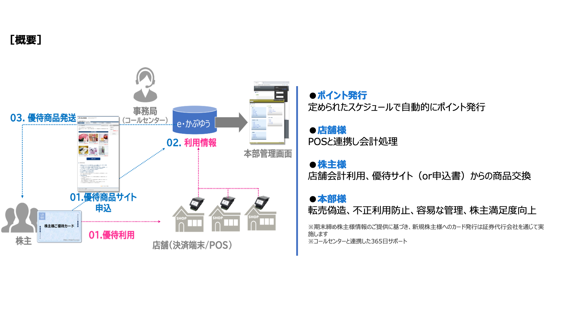 なお 「eかぶゆう」 は、株主優待券を電子ポイント化してセキュアなカードに付与、付与ポイントは指定チェーンでのお支払い、専用サイトで優待商品等と交換ができる仕組みを提供します。