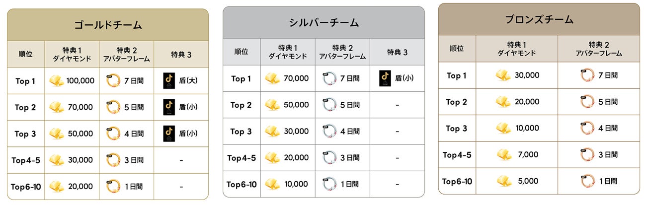 ・チーム分け:過去受け取ったダイヤモンド数に応じて、クリエイターは3つのグループ(ゴールドチーム/シルバーチーム/ブロンズチーム)に分けられます。