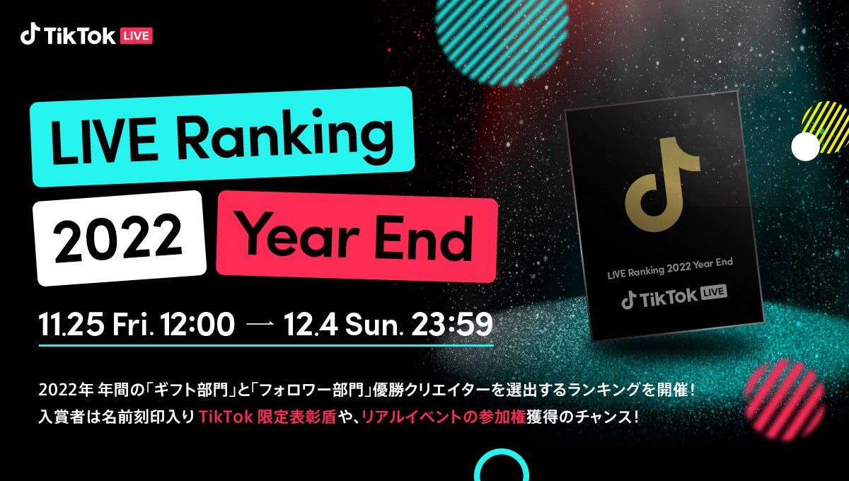 ショートムービープラットフォーム「TikTok(ティックトック)」は、TikTok LIVEで活躍するクリエイターを表彰する「LIVE Ranking -2022 Year End-」を11月25日(金)より開催いたします。2022年最後のLIVE Rankingイベントとなる本企画の上位入賞者には、TikTokアカウント名入りの表彰盾や、TikTok LIVEのプロフィールを装飾するアプリ内アイテムなどの豪華特典を贈呈します。さらに今回は特別に、上位入賞者の中から選出されたクリエイターは、年末に開催予定の、2022年に活躍したTikTok LIVE クリエイターを視聴者が決めるリアルイベントへの参加権をゲットできます!