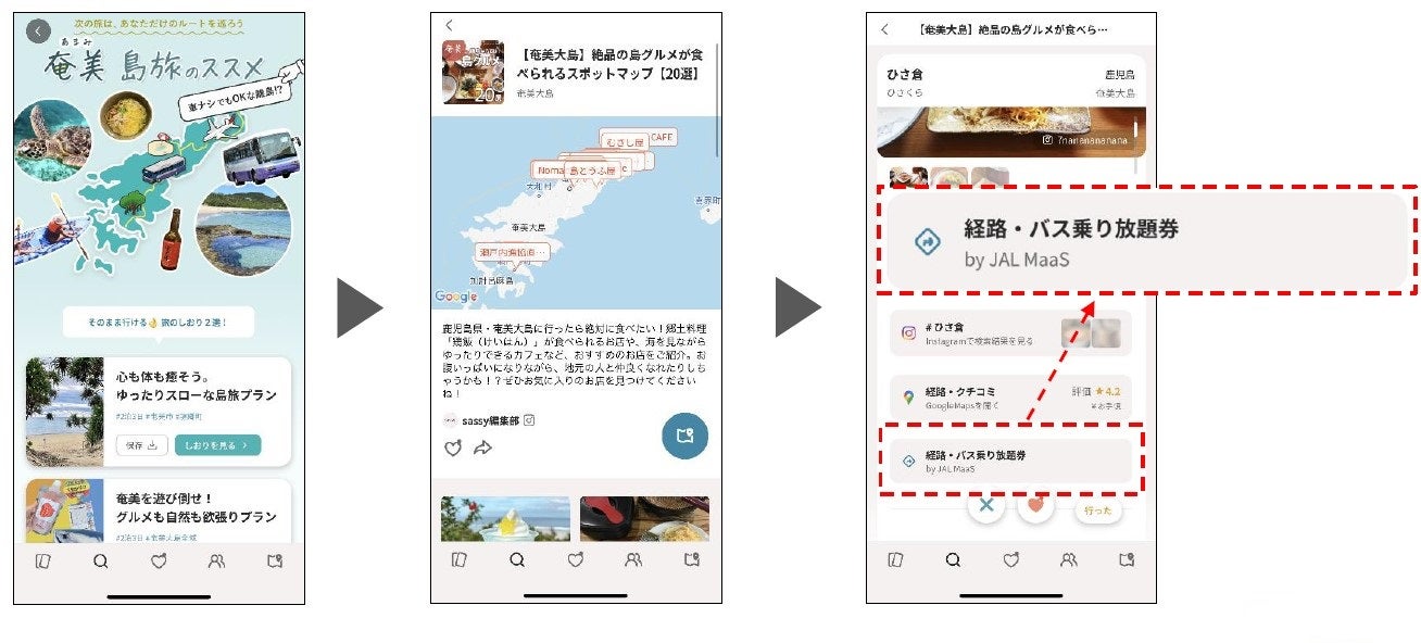 a. sassy:(URL:https://relyontrip.com/sassy/ )「特集ページ」などにおいて、奄美大島のバス旅の特集を実施。気になったお店に行くための経路検索やお得なチケットをJAL MaaSから購入可能。