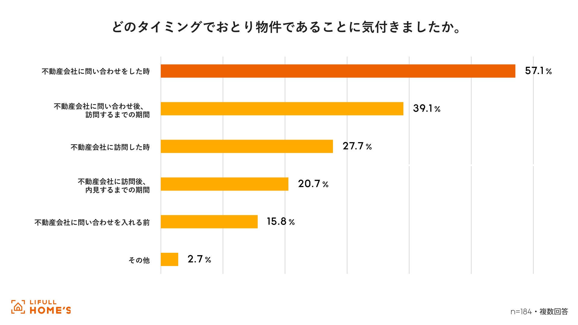 おとり物件であると気づいたタイミングについては、「不動産会社に問い合わせたとき(57.1%)」が最も多く、次いで「問い合わせから訪問までのあいだ(39.1%)」となりました。インターネット上の広告情報をもとに検討している段階では判断が難しく、行動を起こしてから初めて取引できないことが分かる構造になっています。