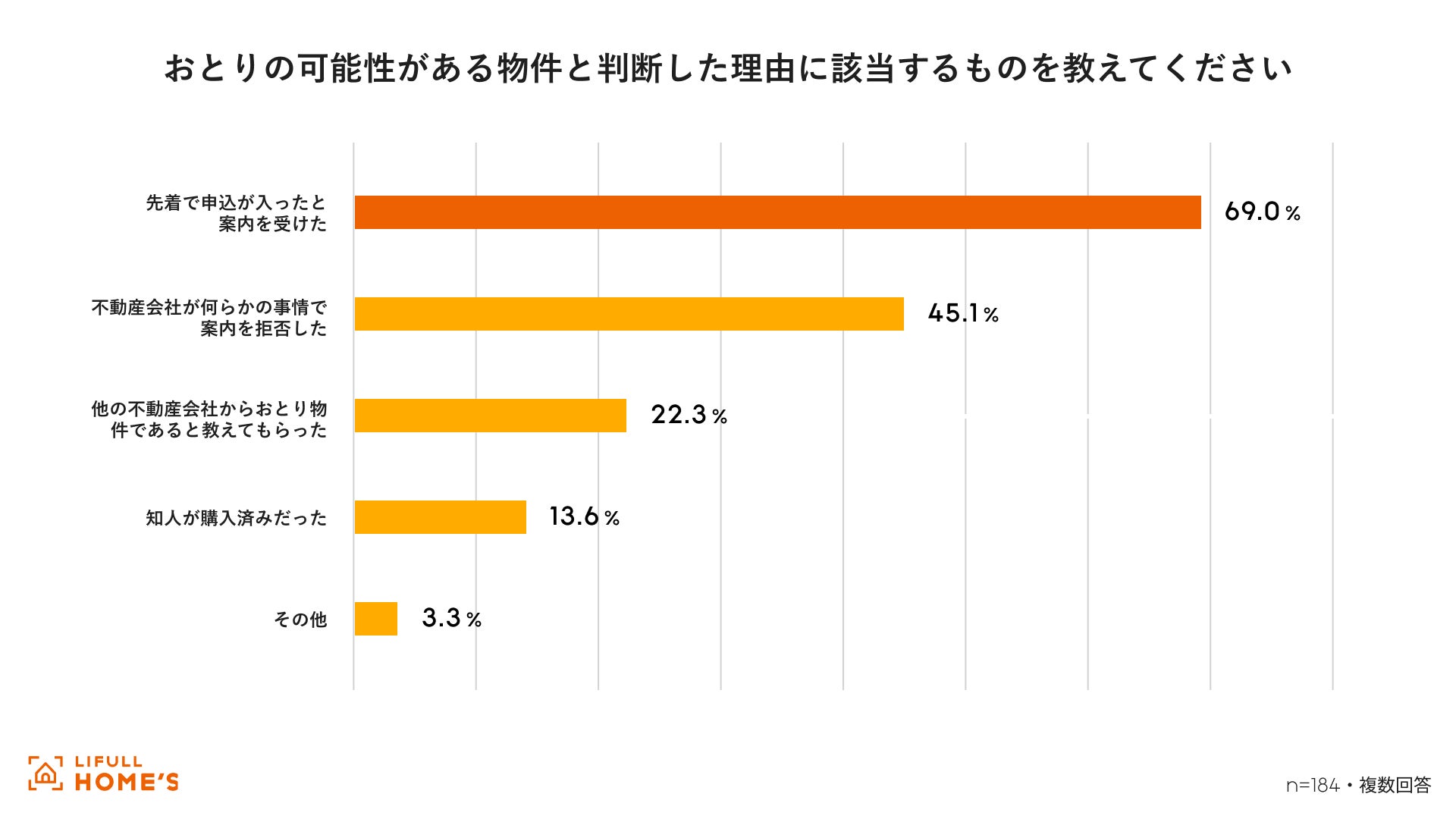 おとり物件に遭遇したと判断した理由として最も多かったのは、「先着で申込が入ったと案内を受けた(69.0%)」でした。次いで、「不動産会社が何らかの事情で案内を拒否した(45.1%)」となっています。消費者が物件情報を閲覧した段階では取引可否が判断できず、実際に不動産会社へ問い合わせを行った後になって、初めて状況が判明するケースが多いことがうかがえます。