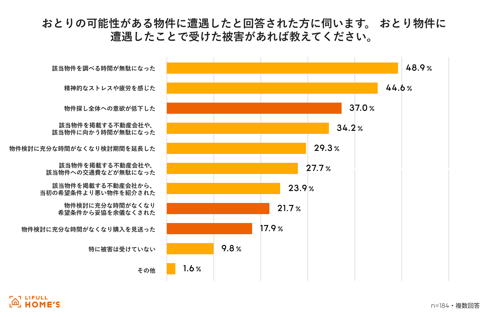 おとり物件による被害としては、「時間のロス(48.9%)」や「精神的ストレス(44.6%)」が上位に挙がったほか、「物件探しへの意欲が低下した」「検討に十分な時間が取れず、希望条件から妥協せざるを得なかった」「購入そのものを見送った」といった回答も見られました。