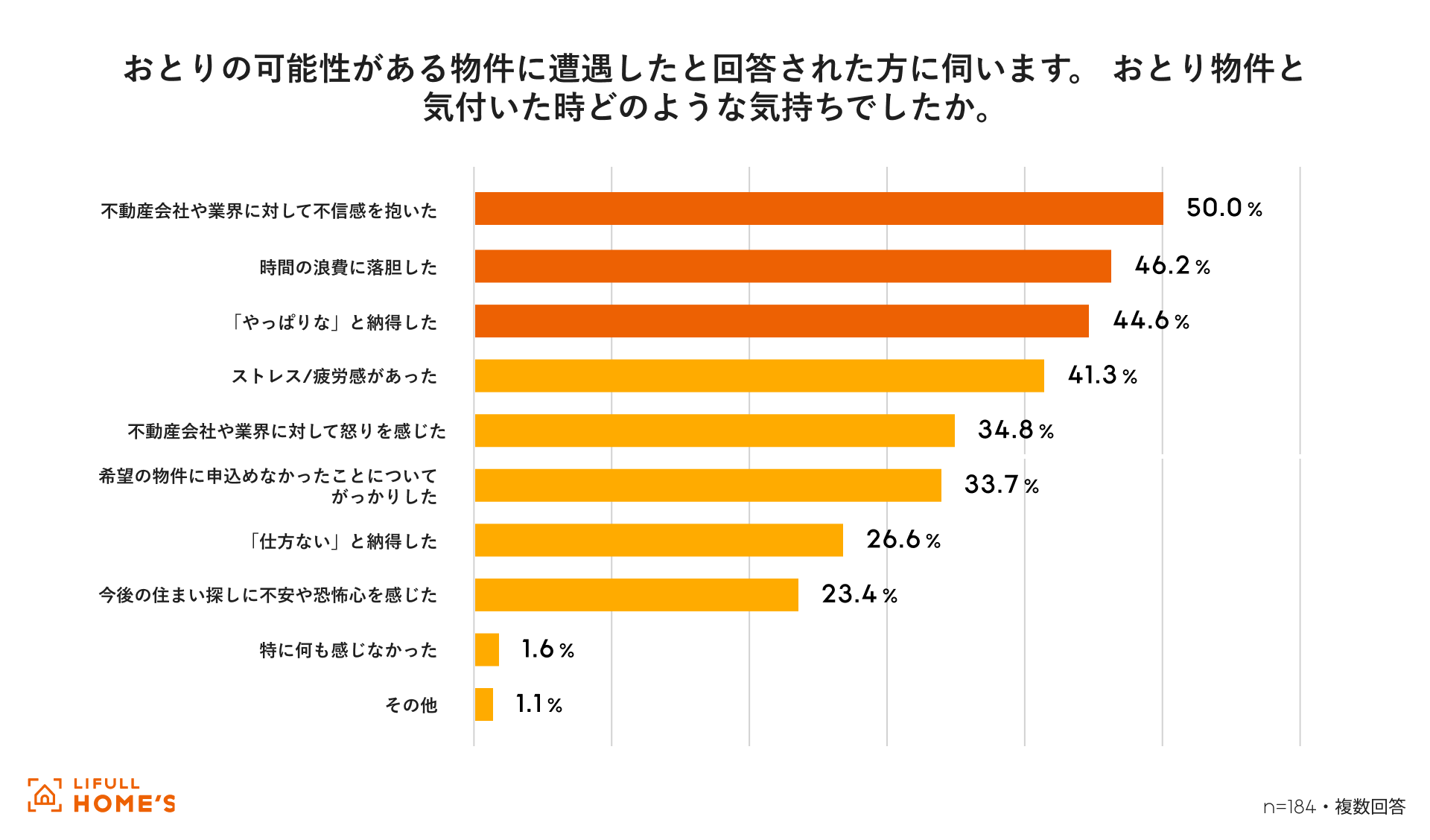 おとり物件に気づいた際の気持ちとしては、「希望の住まいに申し込めなかった」という結果そのものよりも、「不動産会社や業界に対して不信感を抱いた(50.0%)」「やっぱりなと納得した(44.6%)」といった、業界全体に対する不信感を示す回答が多く見られました。単なる機会損失にとどまらず、住まい探しへの信頼感そのものが損なわれていることがうかがえます。
