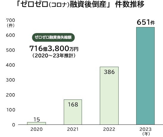 「ゼロゼロ(コロナ)融資後倒産」は、2023年に651件(前年386件、68.7%増)発生、20年以降で最多を更新した。ゼロゼロ融資を利用後の倒産が全体の8%を占める。実際の融資額が判明した約400社のゼロゼロ融資借入額の平均は約5800万円となり、「不良債権(焦げ付き)」に相当するゼロゼロ融資喪失総額は推計で約716億3800万円にのぼる。