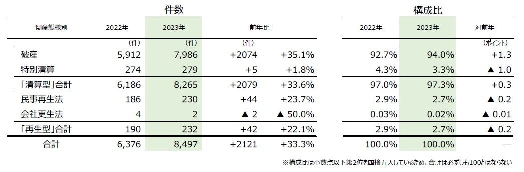 『清算型』では、「破産」が7986件(前年5912件、35.1%増)で最も多く、2015年(7985件)以来8年ぶりの高水準となった。「特別清算」は279件(同274件、1.8%増)と、3年ぶりに前年を上回った。