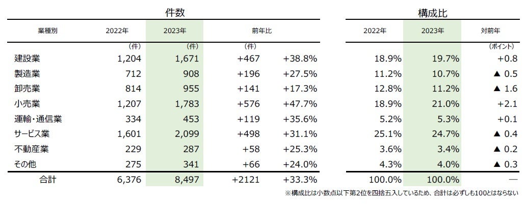 業種別にみると、2008年以来15年ぶりに全7業種で前年を上回った。『サービス業』(前年1601件→2099件、31.1%増)が最も多く、『小売業』(同1207件→1783件、47.7%増)、『建設業』(同1204件→1671件、38.8%増)と続いた。『サービス業』は2012年(2091件)以来11年ぶりに2000件を超えた。『運輸・通信業』(同334件→453件、35.6%増)は、ドライバー不足に悩む「道路貨物運送」(同238件→315件)の大幅増もあり、全体では2010年(452件)以来13年ぶりに450件を記録した。