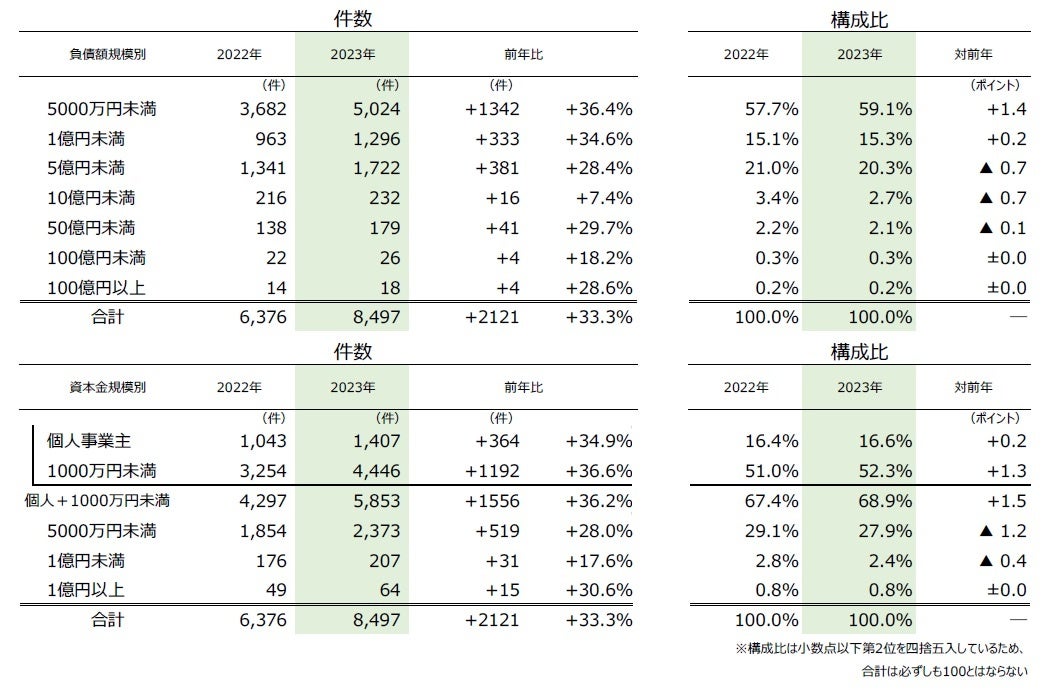 負債額規模別にみると、「5000万円未満」の倒産が5024件(前年3682件、36.4%増)で最も多く、構成比は59.1%(対前年1.4ポイント増)となった。「5億円未満」では1722件(同1341件、28.4%増)発生し、2016年(1781件)以来7年ぶりに1700件を上回った。