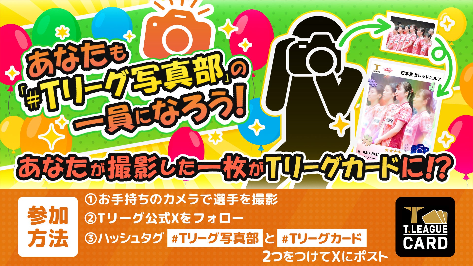 プレーオフ会場では、ファンの皆様にお楽しみいただける参加型企画「#Tリーグ写真部」を実施します。あなたも「#Tリーグ写真部」の一員として、Tリーグカードに写真素材を提供してみませんか?