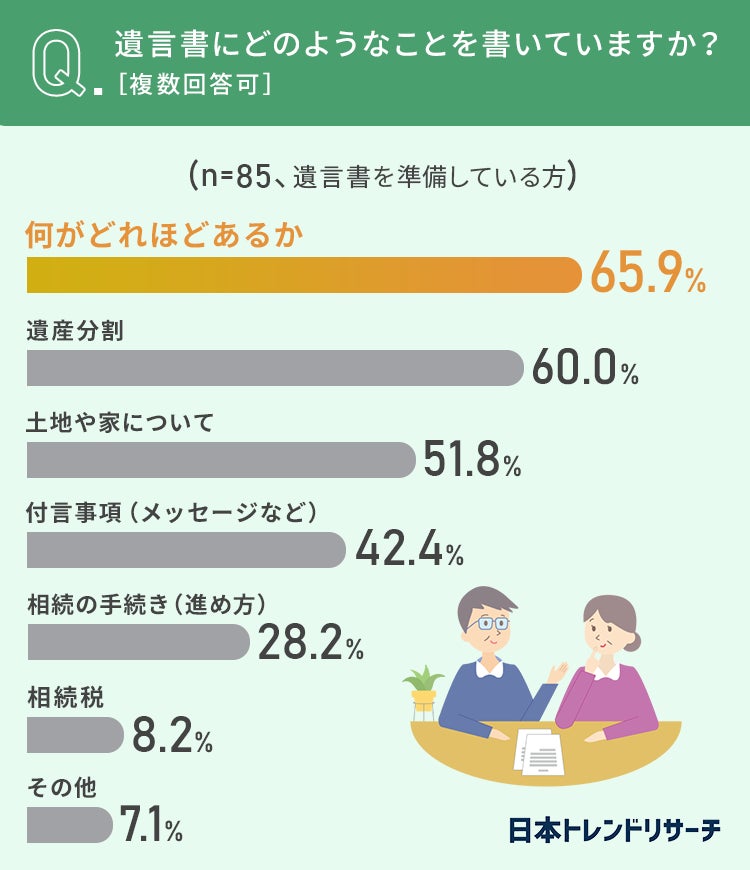続いて、遺言書にどのようなことを書いているか、当てはまるものを選んでもらいました。