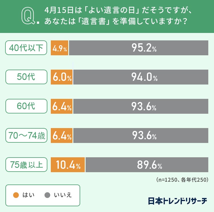 まずは全国の男女1250名の方に、遺言書を用意しているか年代別に聞いてみました。