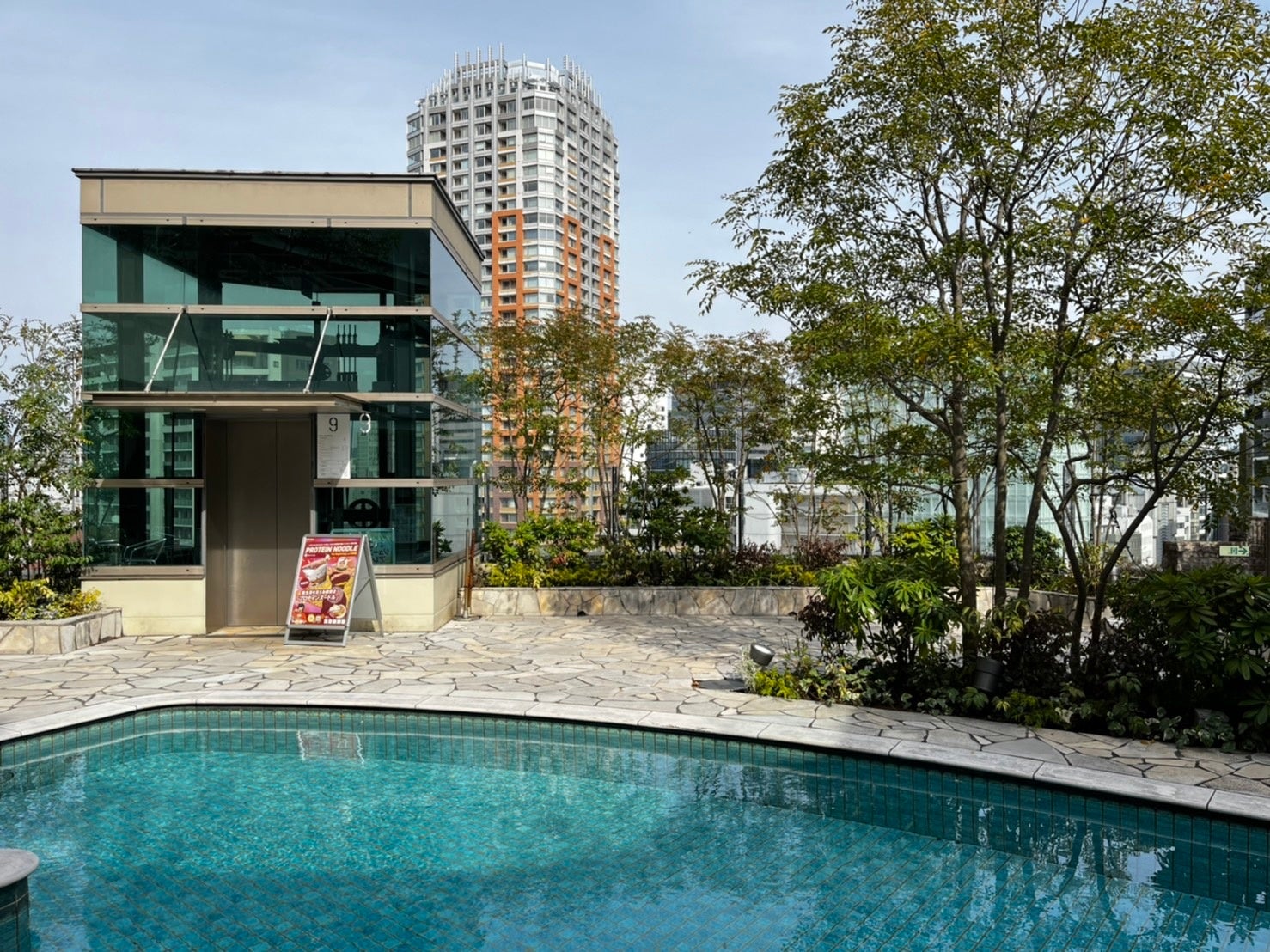 外観にはおしゃれでラグジュアリーなプールがあり、昼と夜で印象が変わるのが特徴。プロテインジュースの販売もしており、脱毛前後でおくつろぎいただくお客様も多くいらっしゃいます。