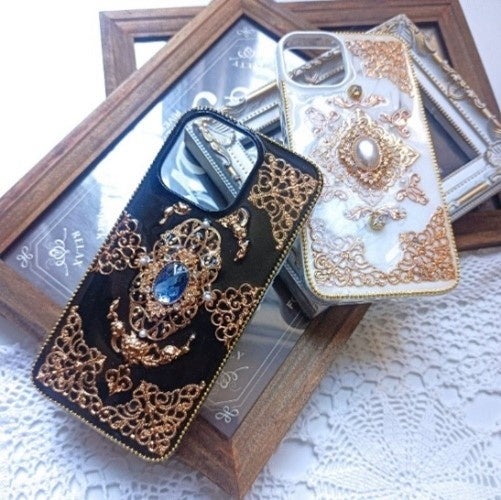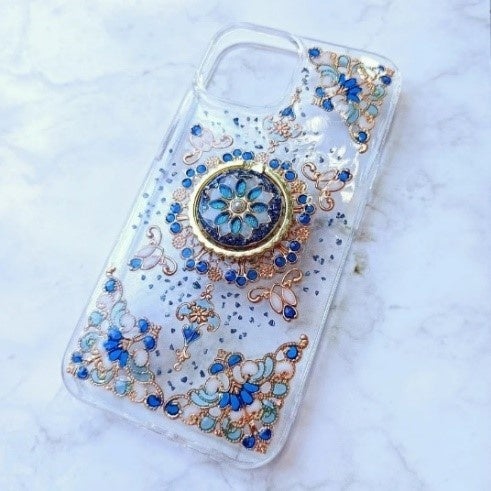 カラフルなステンドグラスを使ってアンティーク雑貨のように仕上げた、おとなカワイイアイテムをそろえます。写真は人気のスマートフォンケース。