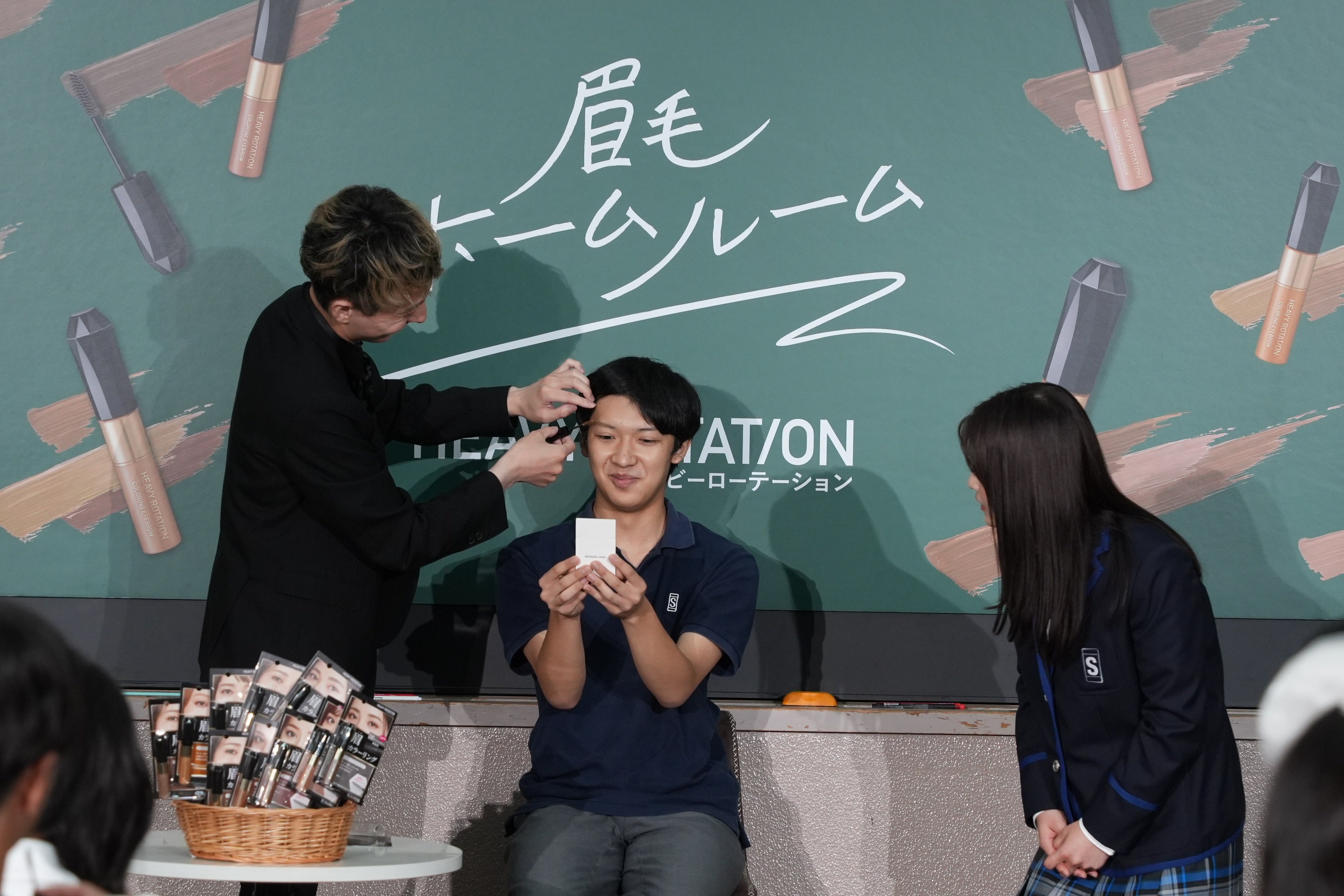 トークセッション後には、実際に石川ユウキさんが男子学生へ、ヘビーローテーションでメイクを行いました。メイク後の男子学生の姿を見て、ヘビーローテーションで眉毛メイクを行うだけで、垢抜けた印象になったと井上さんも大絶賛でした。また、色を変えるだけで眉毛の印象が変わることから、ヘビーローテーションは、簡単で失敗もなくてチャレンジしやすい魅力があるとコメントいただきました。