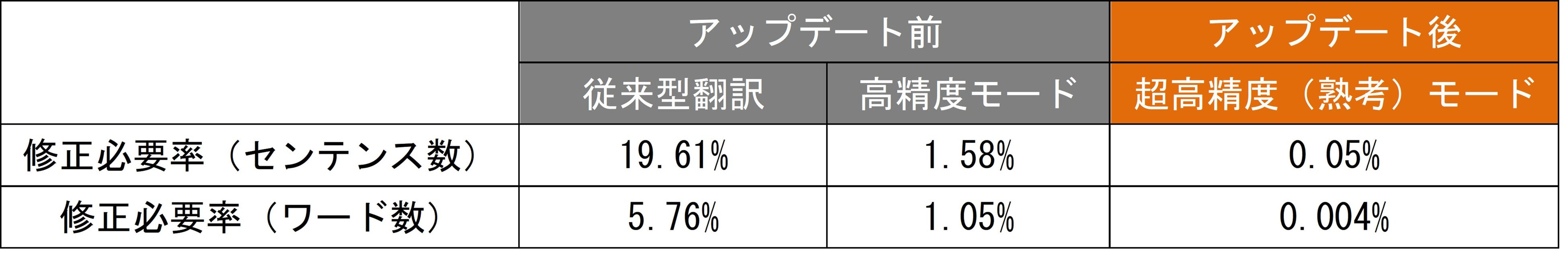 ※数値は、日本語から英語への翻訳の場合に人手修正が必要なワード数およびそれに相当するセンテンス数。センテンス数ベースで修正必要率0.05%は100~200ページに1センテンス程度。