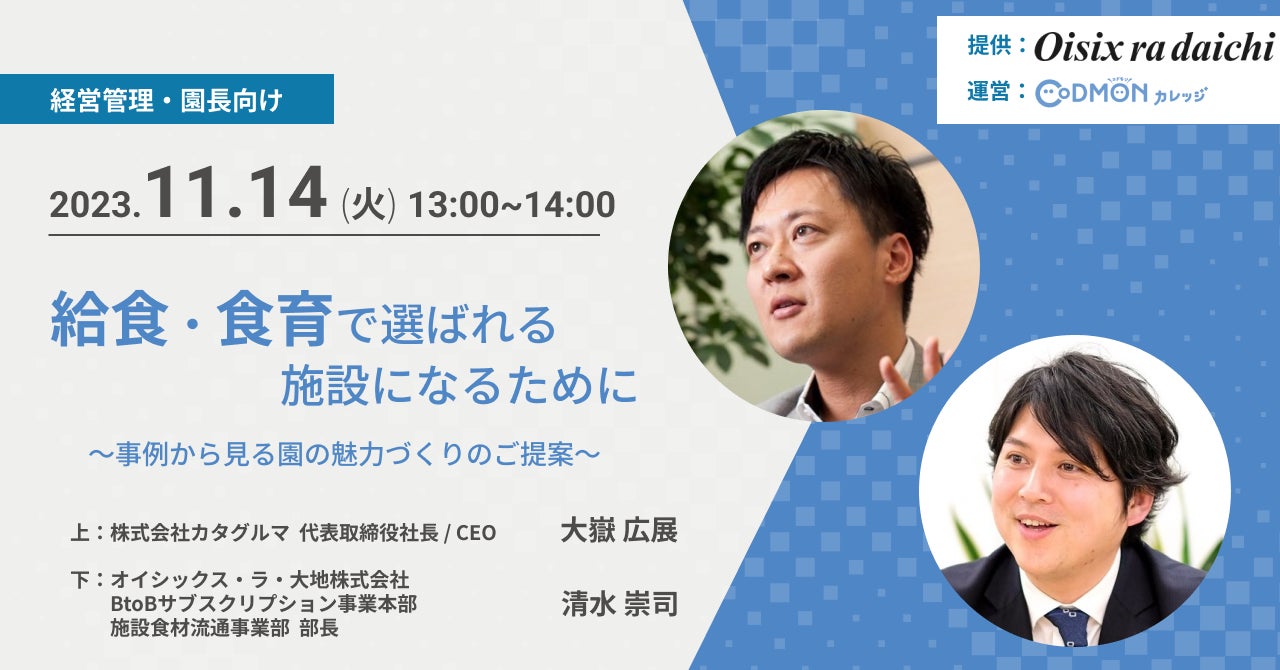 株式会社カタグルマ(本社:東京都千代田区)の代表取締役/CEOの大嶽広展氏からは、保育現場におけるマネジメントの重要性について紹介。当社のBtoBサブスク事業本部 施設食材流通事業部 部長の清水崇司からは、保育業界を取り巻く環境や、給食・食育で選ばれる施設になるためのポイントについて事例とともに紹介します。