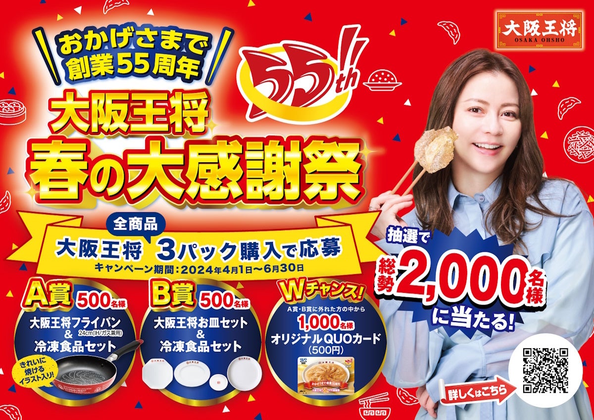 抽選で、大阪王将冷凍食品詰め合わせと、大阪王将フライパンや大阪王将お皿セット、抽選に外れた方にもWチャンスでオリジナルQUOカード500円分が、総勢2,000名様に当たります。