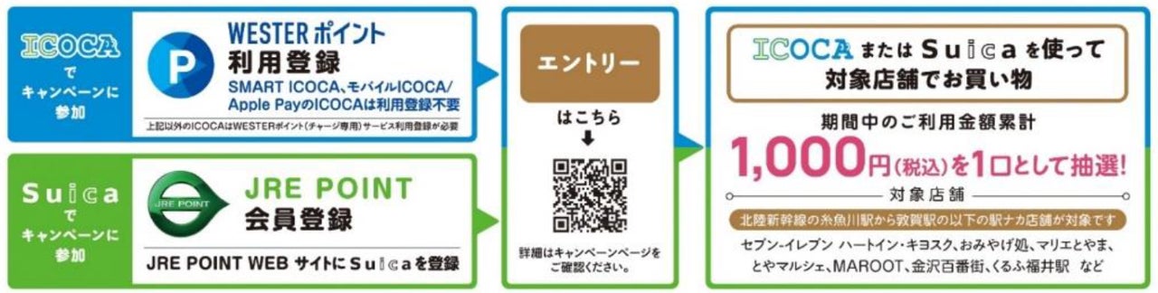 キャンペーンサイト(下記ご参照)からエントリーのうえ、ICOCAまたはSuicaを使って駅ナカ対象店舗(※1)でお買い物された方が対象となります。キャンペーン期間中のICOCAあるいはSuicaのご利用金額累計1,000円(税込)を1口(※2)として、抽選でICOCA・Suicaそれぞれ200名様(計400名様)にWESTERポイントまたはJRE POINTをプレゼント。