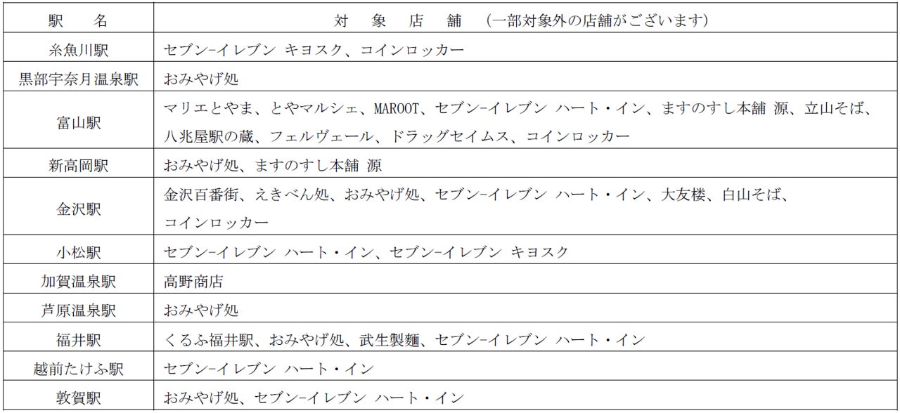 北陸新幹線の糸魚川駅から敦賀駅の駅ナカ店舗で、店頭POPがあるところが対象です。